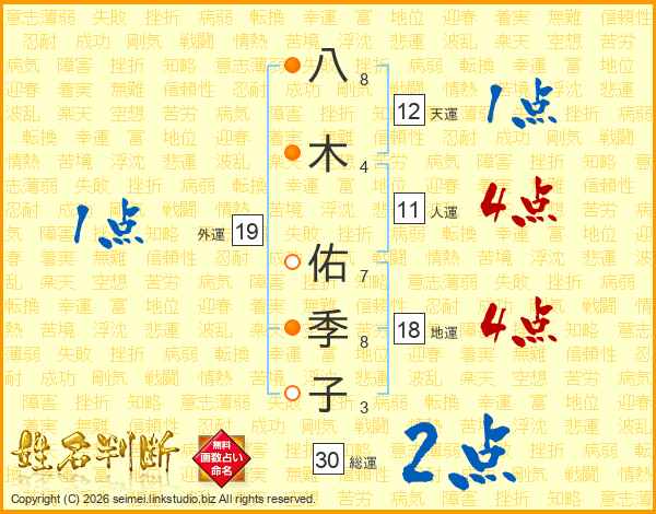 八(8画)木(4画) 佑(7画)季(8画)子(3画)