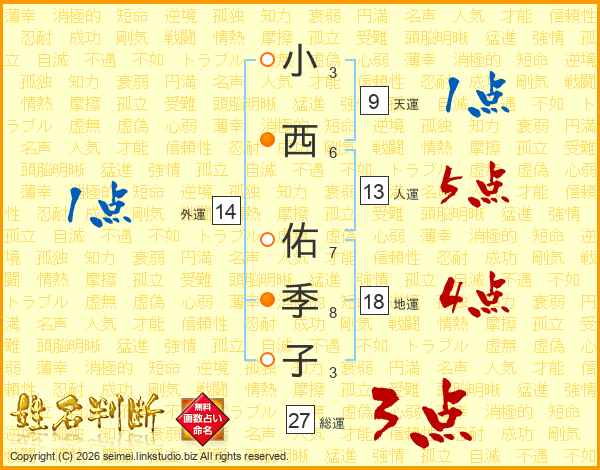 小(3画)西(6画) 佑(7画)季(8画)子(3画)