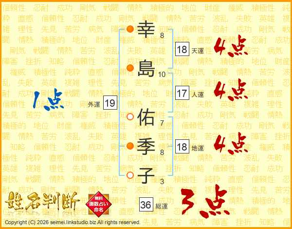 幸(8画)島(10画) 佑(7画)季(8画)子(3画)