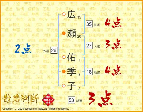 広(15画)瀬(20画) 佑(7画)季(8画)子(3画)