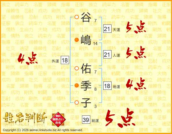 谷嶋佑季子さんの総運は39画の5点!