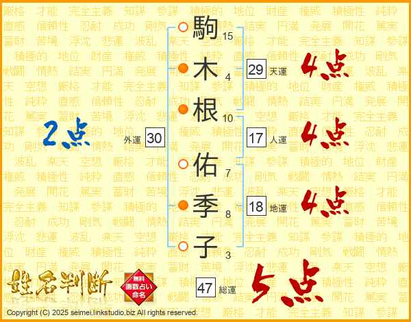 駒(15画)木(4画)根(10画) 佑(7画)季(8画)子(3画)