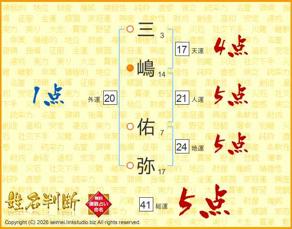 三(3画)嶋(14画) 佑(7画)弥(17画)