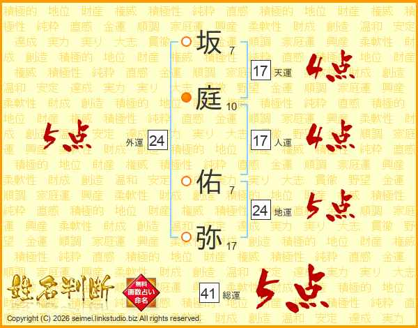 坂(7画)庭(10画) 佑(7画)弥(17画)