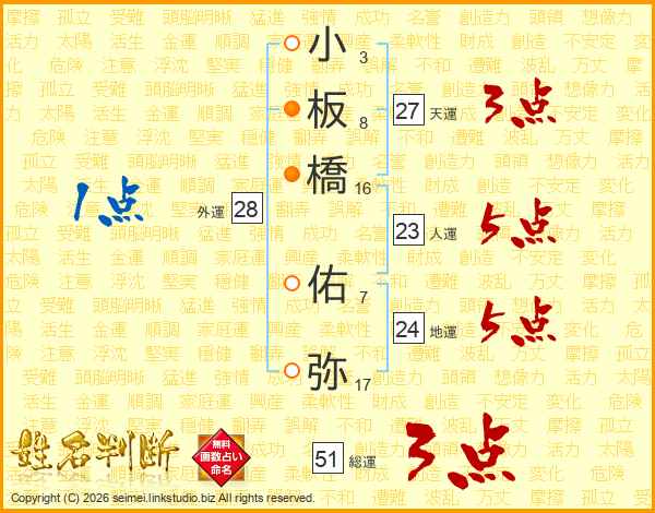 小板橋佑弥さんの総運は51画の3点!