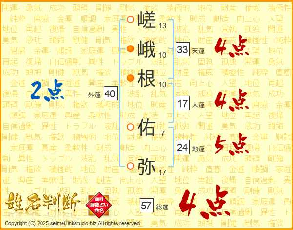 嵯(13画)峨(10画)根(10画) 佑(7画)弥(17画)