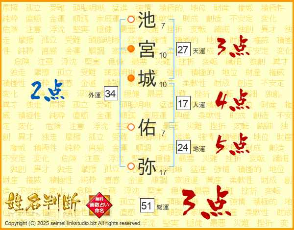 池(7画)宮(10画)城(10画) 佑(7画)弥(17画)