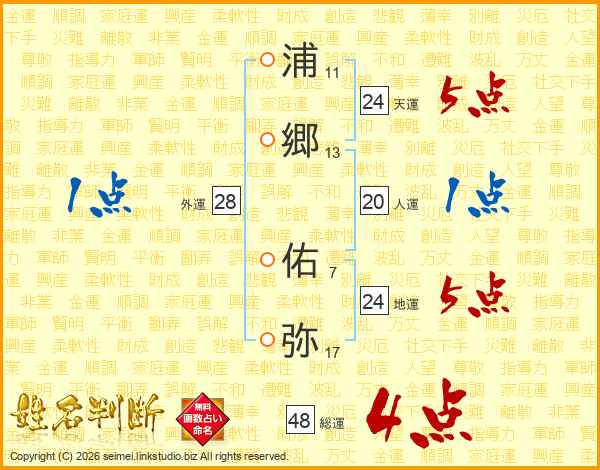 浦(11画)郷(13画) 佑(7画)弥(17画)