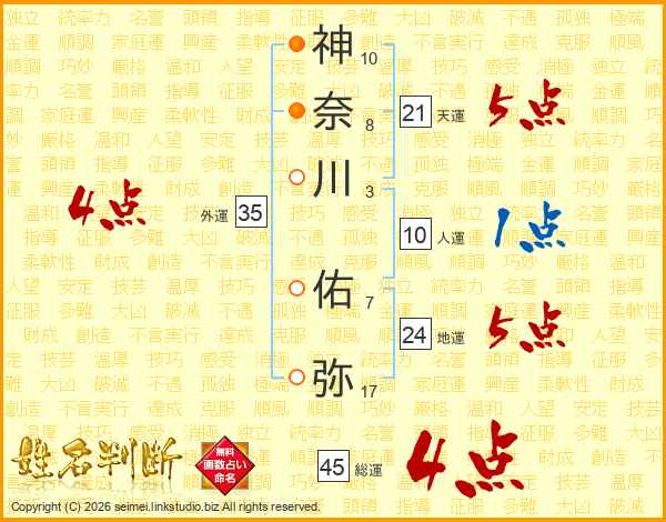 神奈川佑弥さんの総運は45画の4点!
