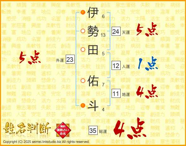 伊(6画)勢(13画)田(5画) 佑(7画)斗(4画)