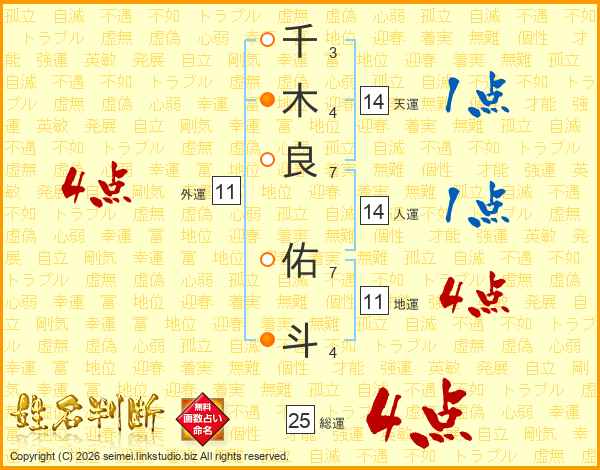 千(3画)木(4画)良(7画) 佑(7画)斗(4画)
