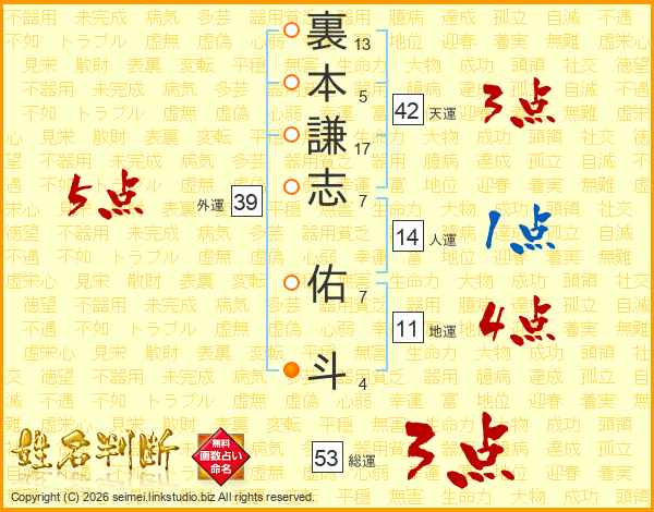 裏本謙志佑斗さんの総運は53画の3点!