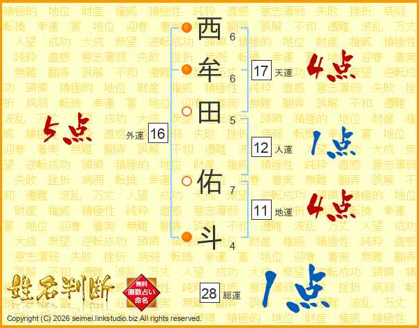 西(6画)牟(6画)田(5画) 佑(7画)斗(4画)