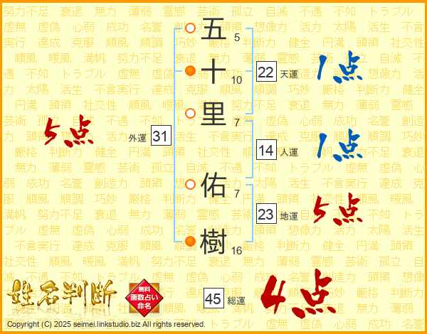 五(5画)十(10画)里(7画) 佑(7画)樹(16画)
