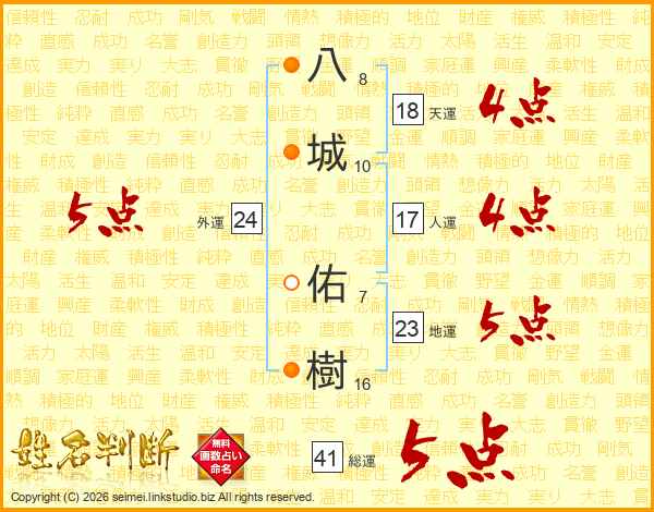 八(8画)城(10画) 佑(7画)樹(16画)