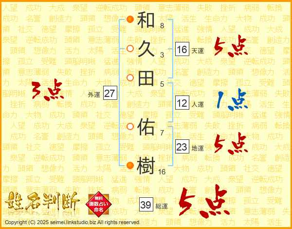 和(8画)久(3画)田(5画) 佑(7画)樹(16画)