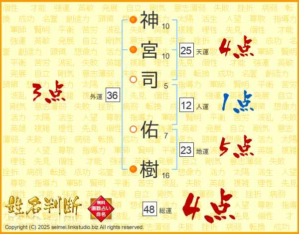 神(10画)宮(10画)司(5画) 佑(7画)樹(16画)