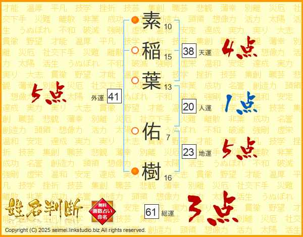 素(10画)稲(15画)葉(13画) 佑(7画)樹(16画)