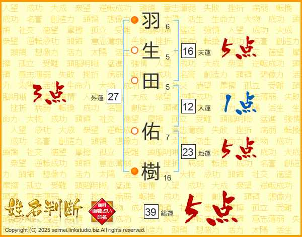 羽(6画)生(5画)田(5画) 佑(7画)樹(16画)