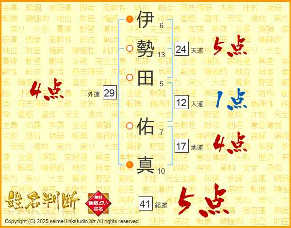 伊(6画)勢(13画)田(5画) 佑(7画)真(10画)