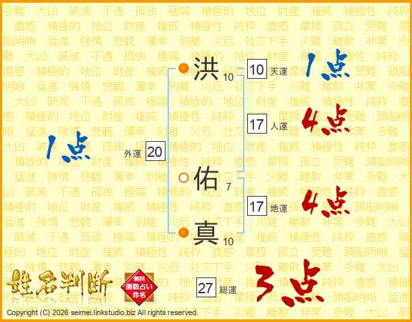 生活面を象徴する運勢です。外部から受ける影響力を表し、結婚運、家庭運や職場、環境への順応性を表します。総運から人運を引いた画数。姓や名が1文字の場合を除く。