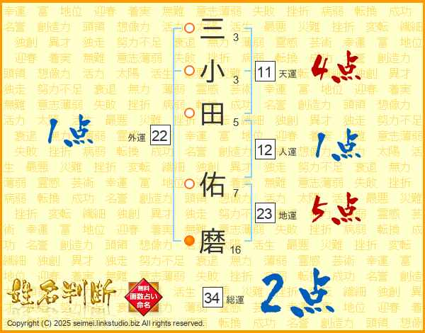 三小田佑磨さんの天運は11画の4点!