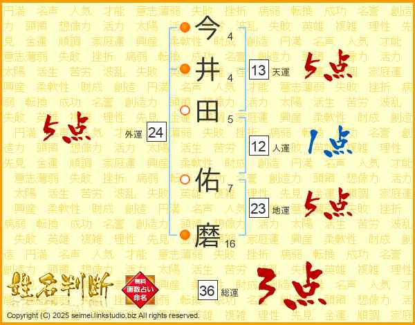 今(4画)井(4画)田(5画) 佑(7画)磨(16画)