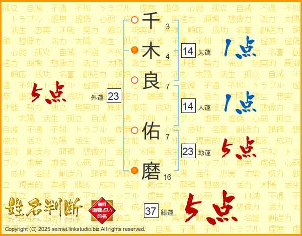 千(3画)木(4画)良(7画) 佑(7画)磨(16画)