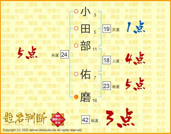 小(3画)田(5画)部(11画) 佑(7画)磨(16画)