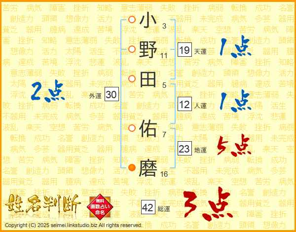 小(3画)野(11画)田(5画) 佑(7画)磨(16画)