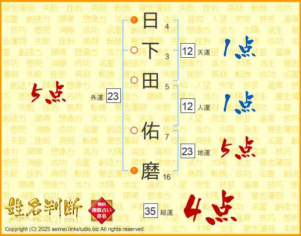 日(4画)下(3画)田(5画) 佑(7画)磨(16画)