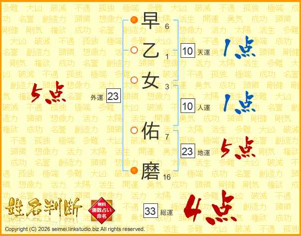 生活面を象徴する運勢です。外部から受ける影響力を表し、結婚運、家庭運や職場、環境への順応性を表します。総運から人運を引いた画数。姓や名が1文字の場合を除く。