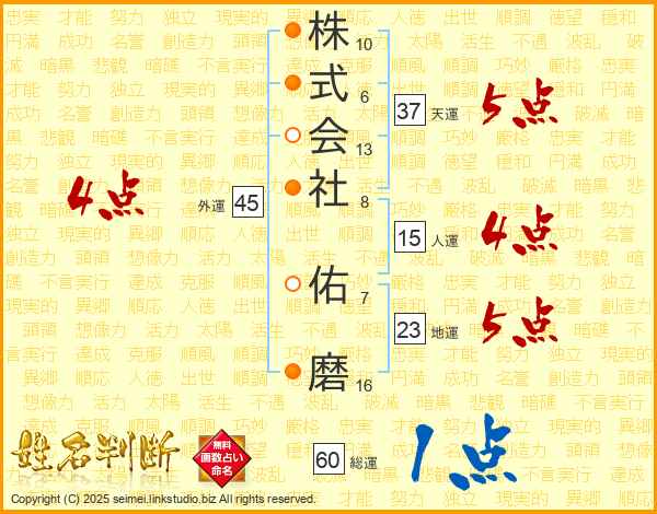株式会社佑磨さんの総運は60画の1点!
