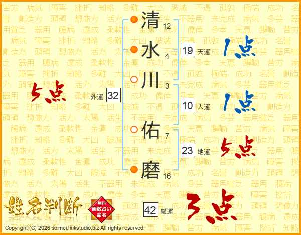清(12画)水(4画)川(3画) 佑(7画)磨(16画)