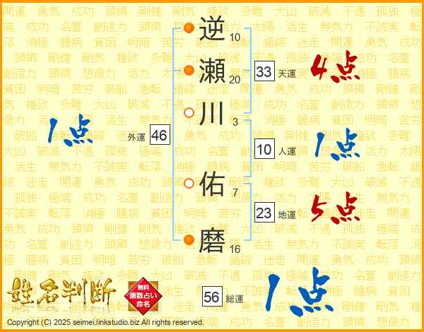 逆(10画)瀬(20画)川(3画) 佑(7画)磨(16画)