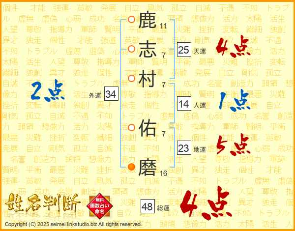 鹿(11画)志(7画)村(7画) 佑(7画)磨(16画)
