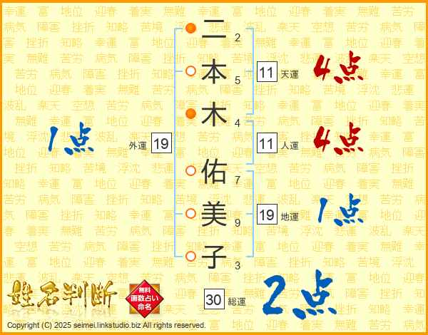 二(2画)本(5画)木(4画) 佑(7画)美(9画)子(3画)
