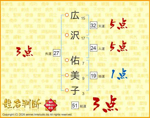 広(15画)沢(17画) 佑(7画)美(9画)子(3画)