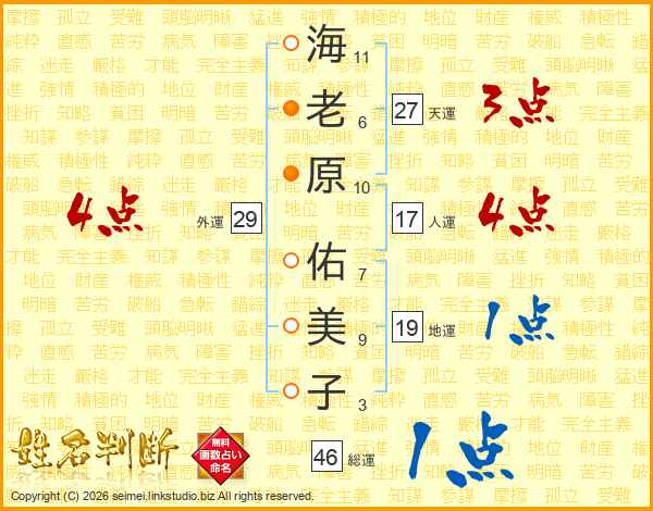 海(11画)老(6画)原(10画) 佑(7画)美(9画)子(3画)