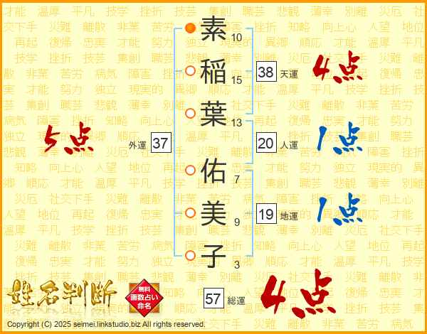 素(10画)稲(15画)葉(13画) 佑(7画)美(9画)子(3画)