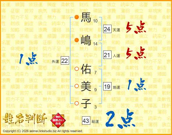 馬嶋佑美子さんの総運は43画の2点!