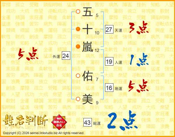 五(5画)十(10画)嵐(12画) 佑(7画)美(9画)