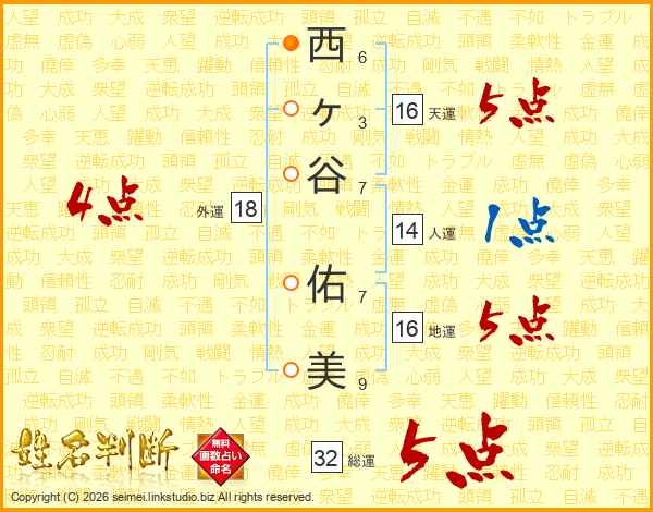西(6画)ヶ(3画)谷(7画) 佑(7画)美(9画)