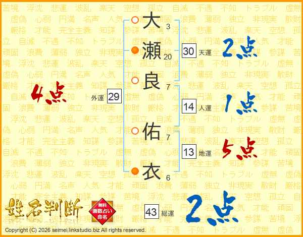 大瀬良佑衣さんの総運は43画の2点!