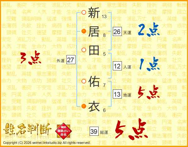 新(13画)居(8画)田(5画) 佑(7画)衣(6画)