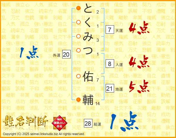 と(2画)く(1画)み(3画)つ(1画) 佑(7画)輔(14画)
