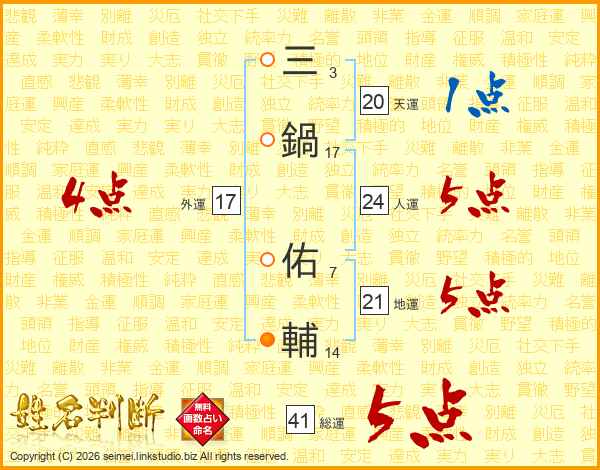 三(3画)鍋(17画) 佑(7画)輔(14画)