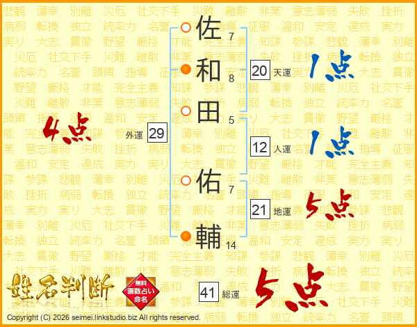 佐(7画)和(8画)田(5画) 佑(7画)輔(14画)