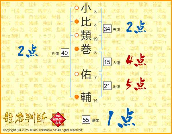 小(3画)比(4画)類(19画)巻(8画) 佑(7画)輔(14画)