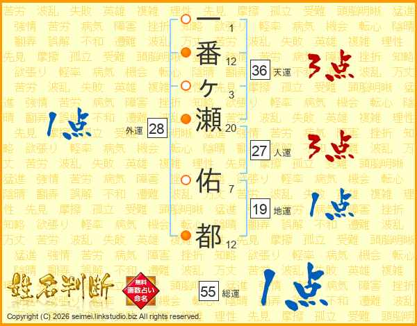 一(1画)番(12画)ヶ(3画)瀬(20画) 佑(7画)都(12画)